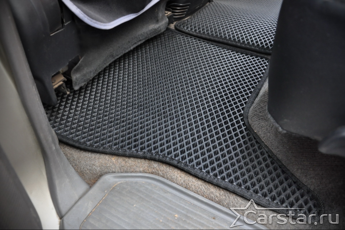 Толщина ковриков EVA составляет 10-12 мм. Глубина ячеек 7-8 мм. Такая толщина ковриков позволяет им служить довольно долго, не протираясь до 3 лет. А благодаря такой глубине ячеек коврик EVA площадью 1 кв.м. способен захватить около 3,5 л жидкости, сохраняя в чистоте вашу обувь и обивку салона.